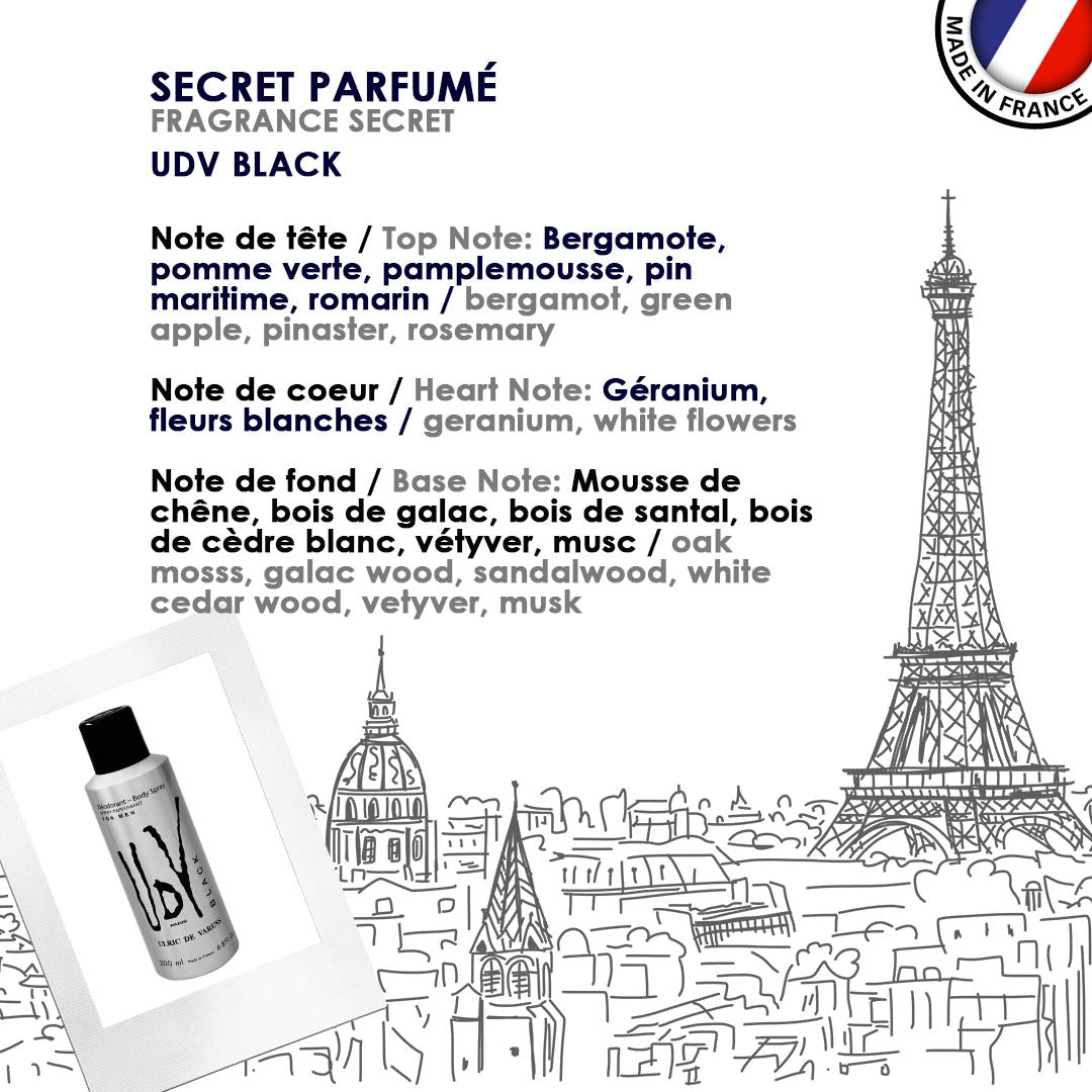 UDV BLACK for Men ist eine frische Komposition aus Bergamotte, grünem Apfel und Grapefruit und betört in der Herznote mit einer süßen Mischung aus Geranie und weißen Blumen, abgerundet mit würzigen Noten aus Zedernholz und Eichenmoos.