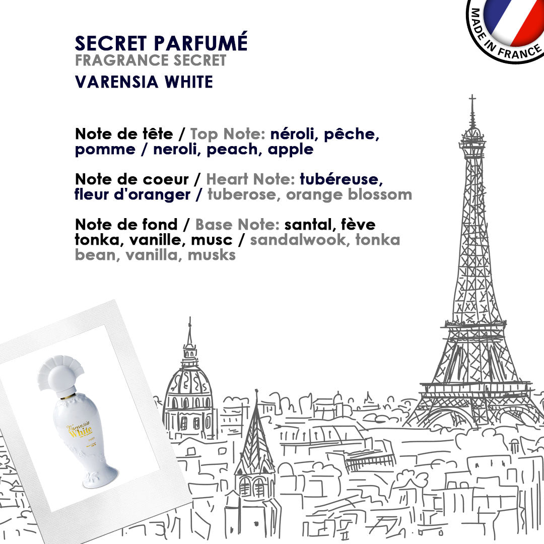 Geheimnisvoll, leidenschaftlich, sinnlich: Der neue Duft Varensia White ist ein elegantes, feminines Parfum aus fruchtigen Apfel- und Pfirsichnoten, denen sich der zarte Duft von Orangenblüte und Tuberose anschließt. Im Fond hüllt das Eau de Parfum seine Trägerin in würzige Aromen von Tonkabohne, Sandelholz und warmer Vanille.